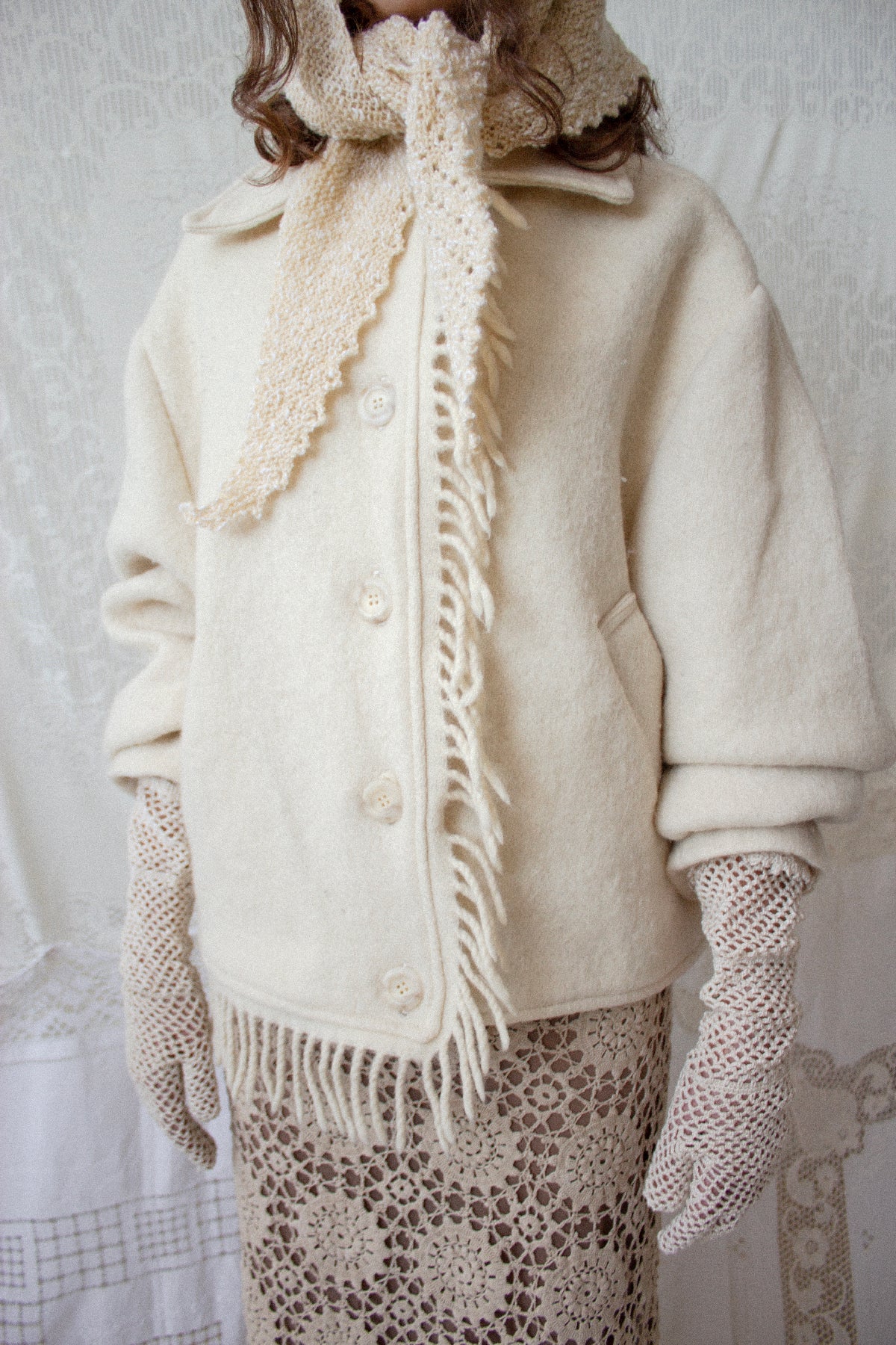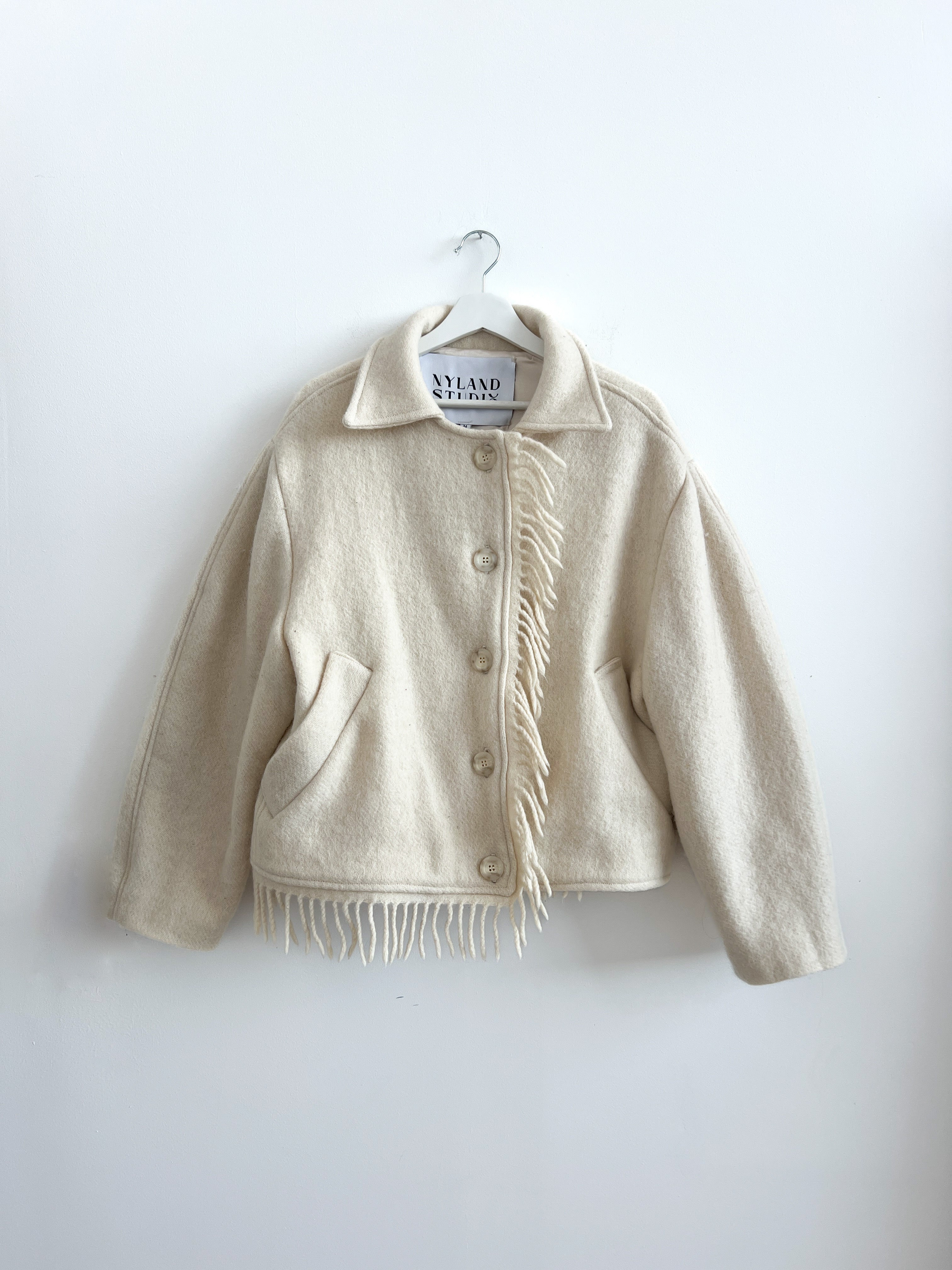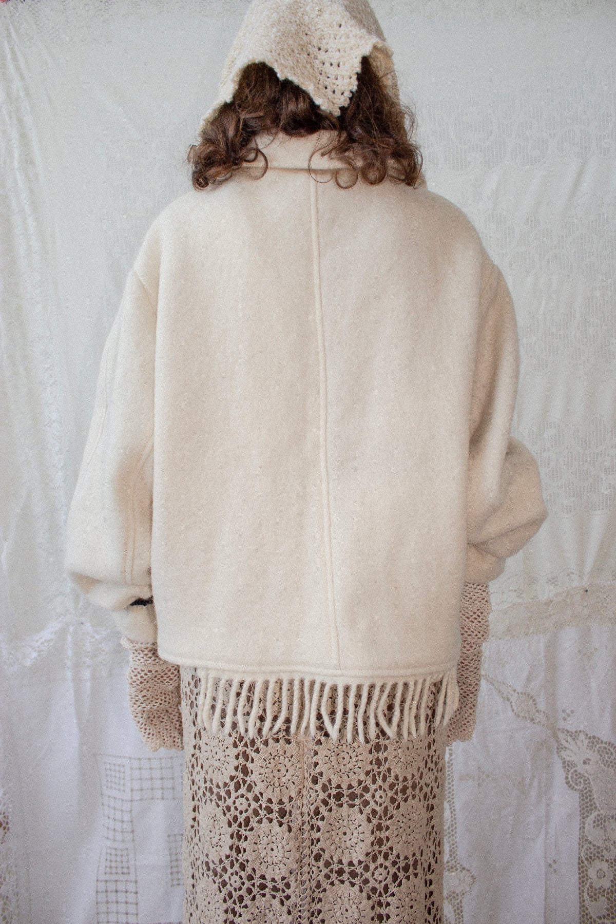 The Blanket Jacket is an oversize, dropped shoulder shape with rounded sleeves that adds to the enveloping silhouette. It features a plain collar, asymmetric fringes down the center front and along one side of the hemline, and is closed with cream faux horn buttons. It is perfect for cold winter days as it feels like wrapping yourself up in a warm blanket.