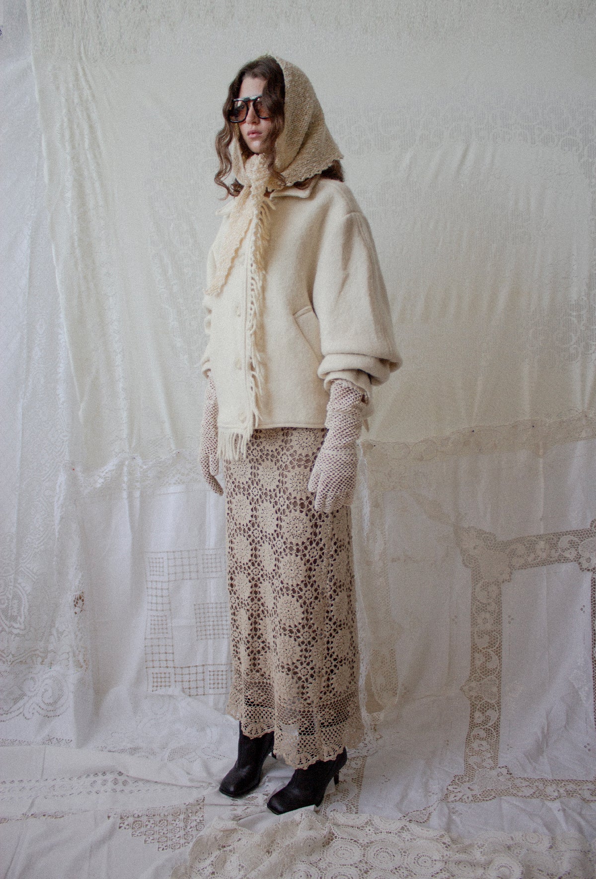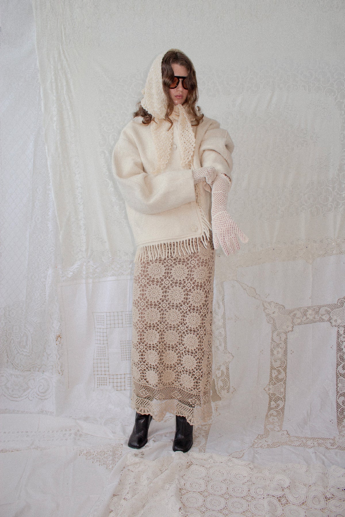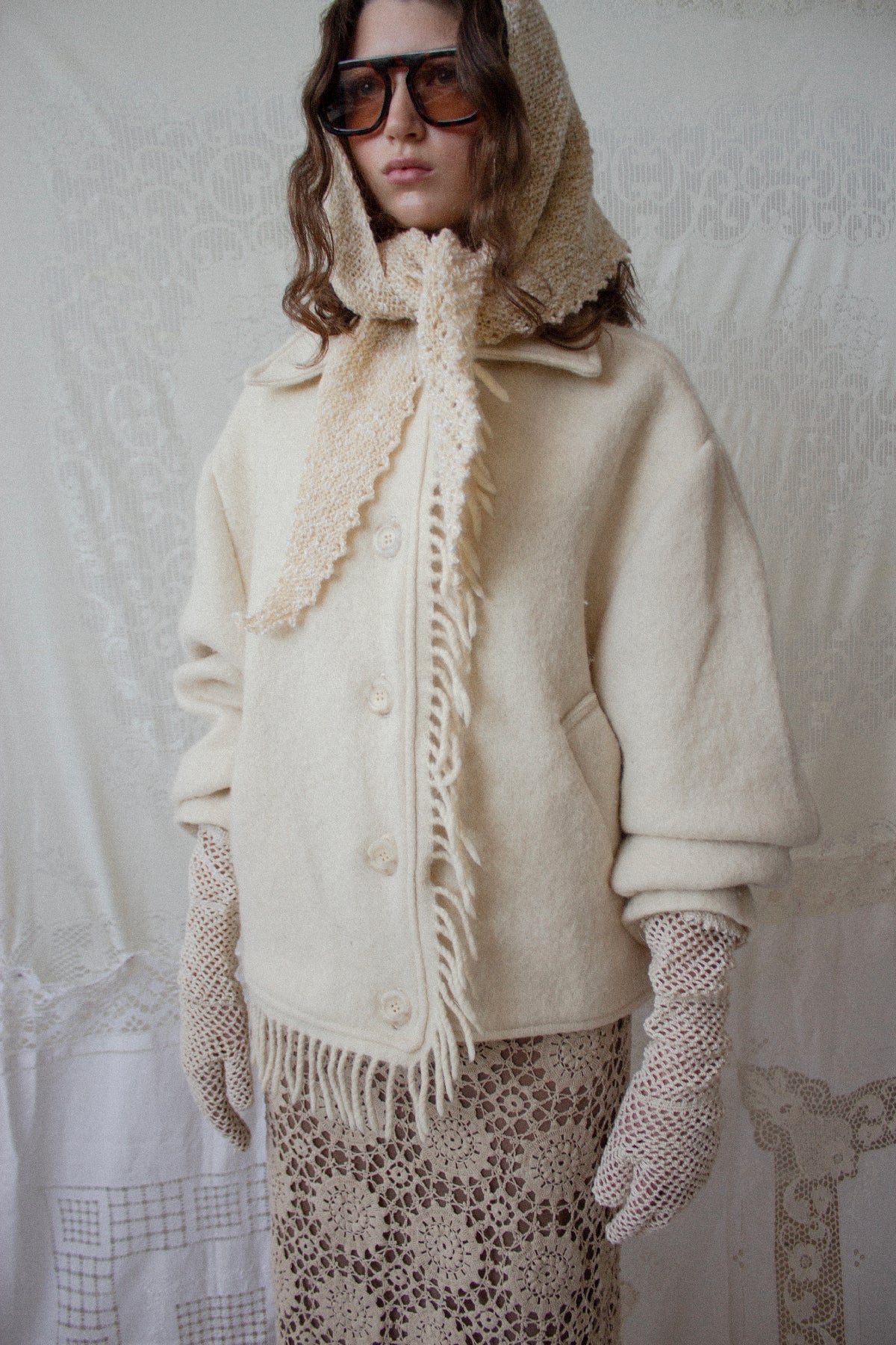 The Blanket Jacket is an oversize, dropped shoulder shape with rounded sleeves that adds to the enveloping silhouette. It features a plain collar, asymmetric fringes down the center front and along one side of the hemline, and is closed with cream faux horn buttons. It is perfect for cold winter days as it feels like wrapping yourself up in a warm blanket.