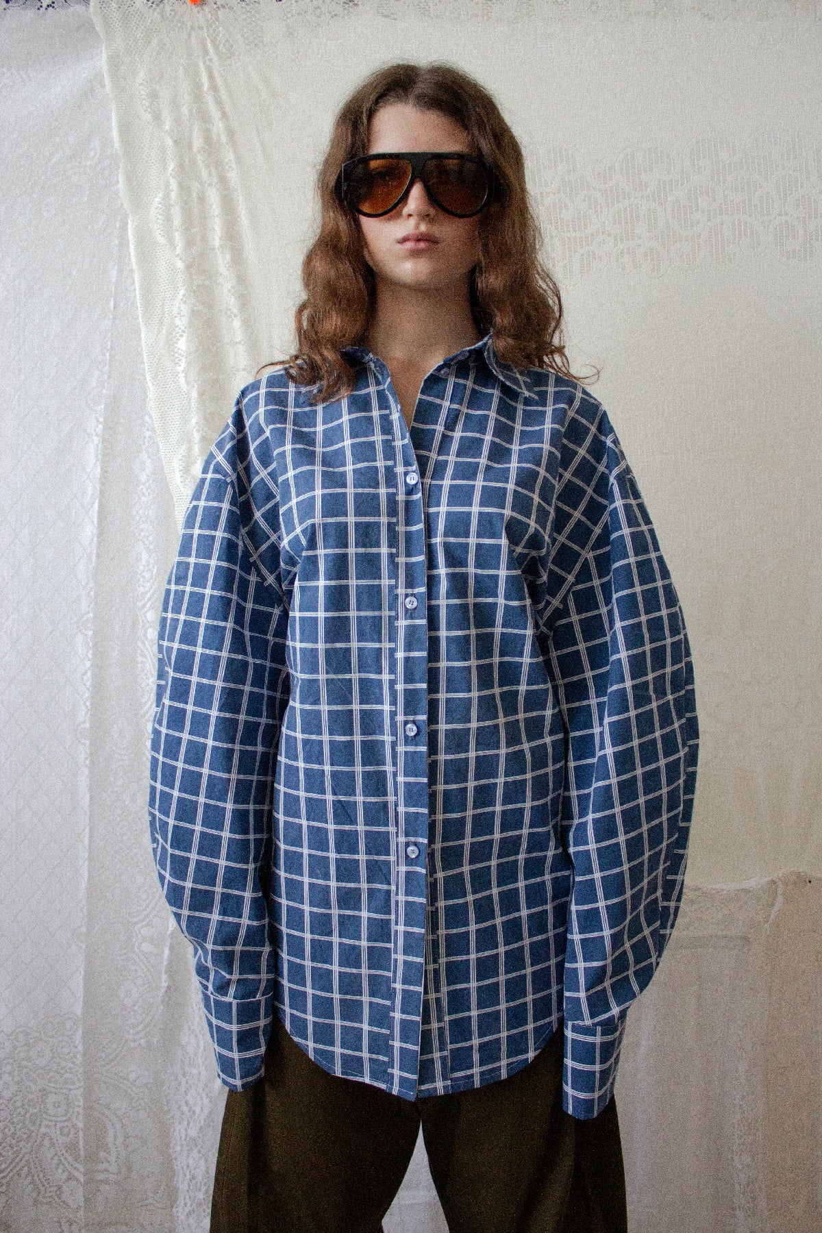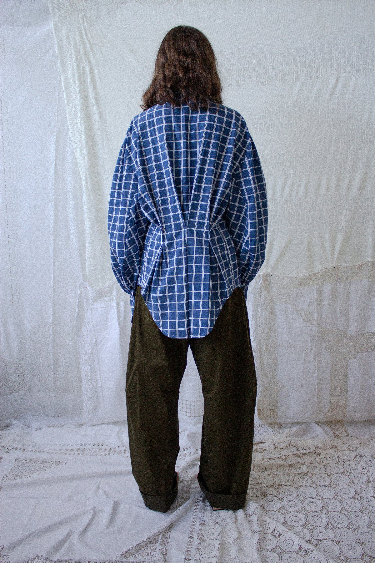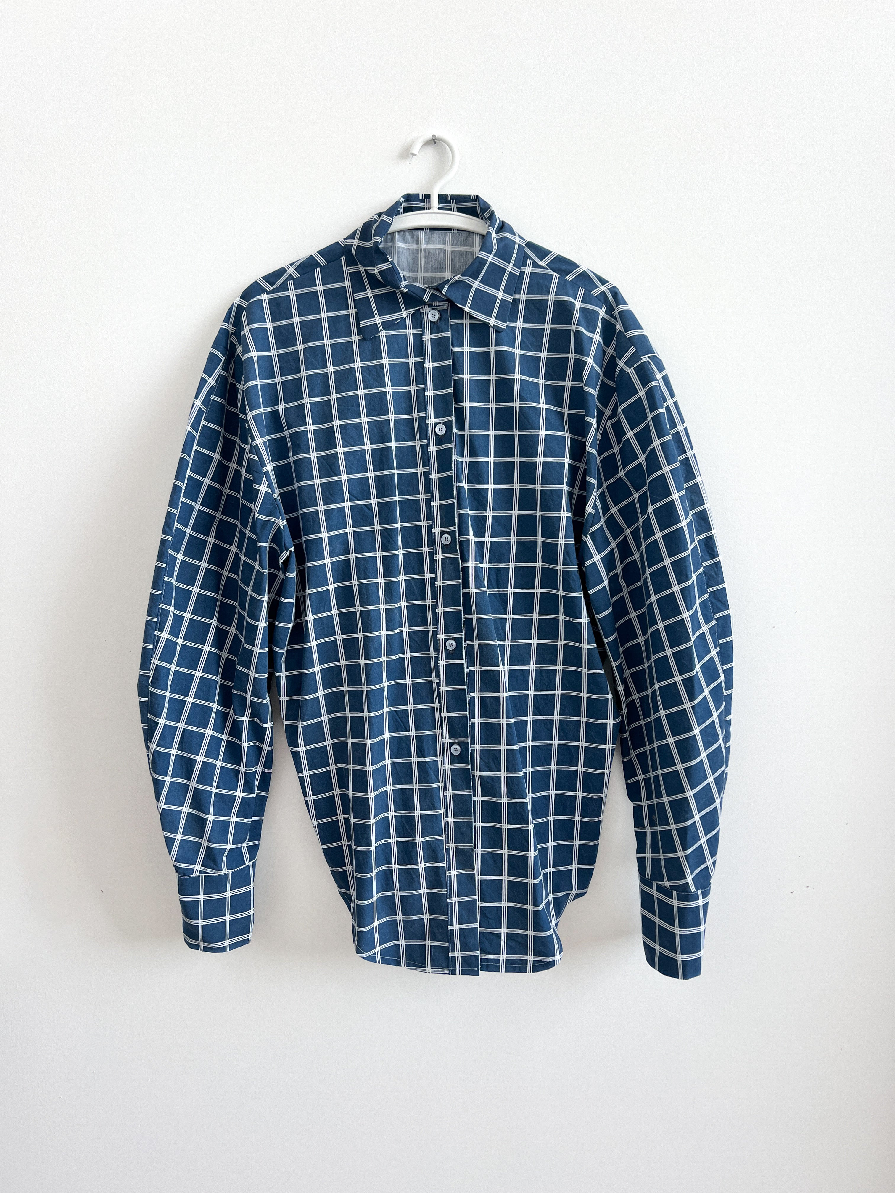 The Blue Check O Shirt is a loose fit elongated silhouette, with a curved hemline and rounded sleeves. It features 3 inverted box pleats at the low waist on the back, creating a flattering drape, but also makes the shirt look more slime line from the front.