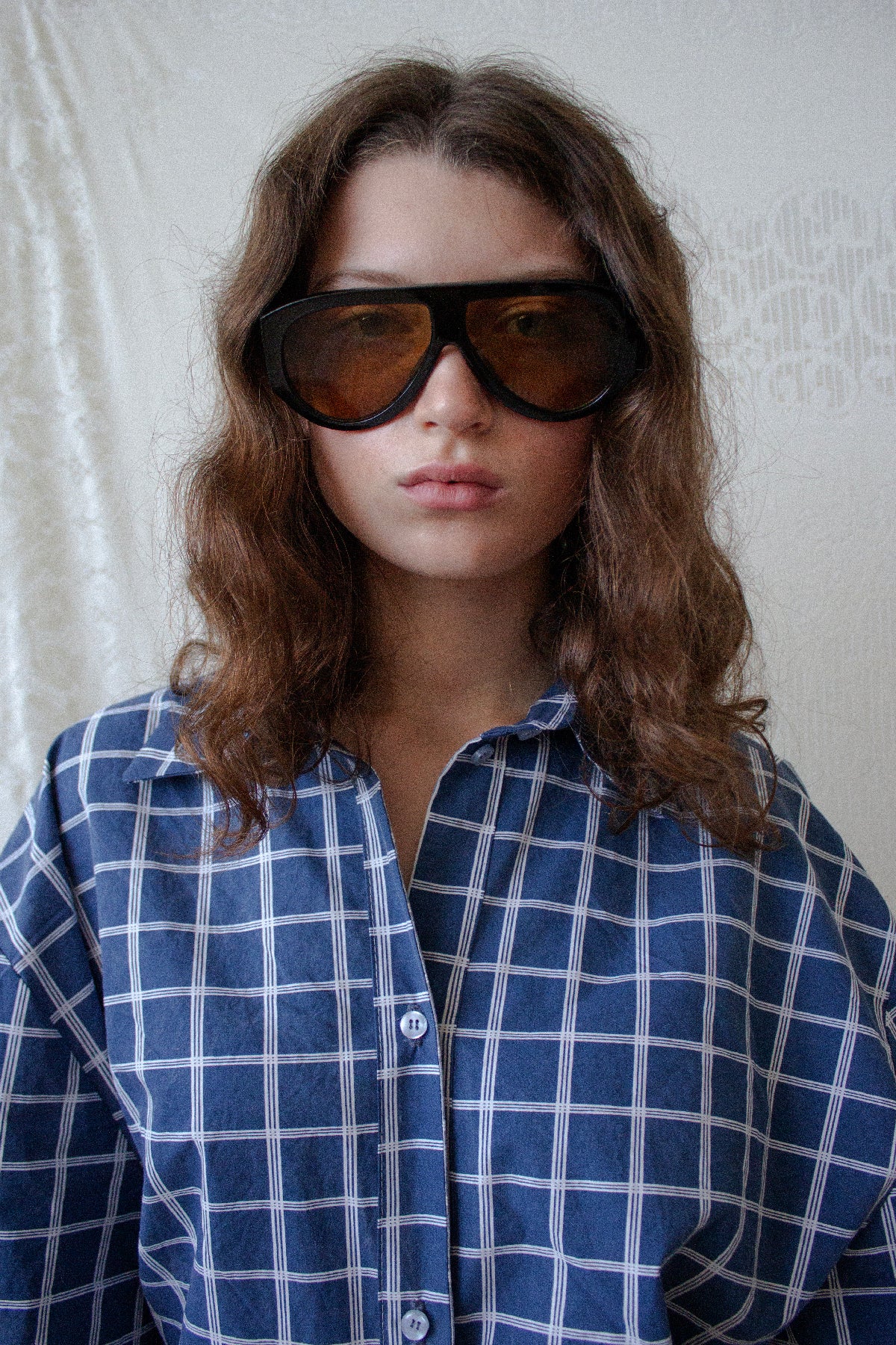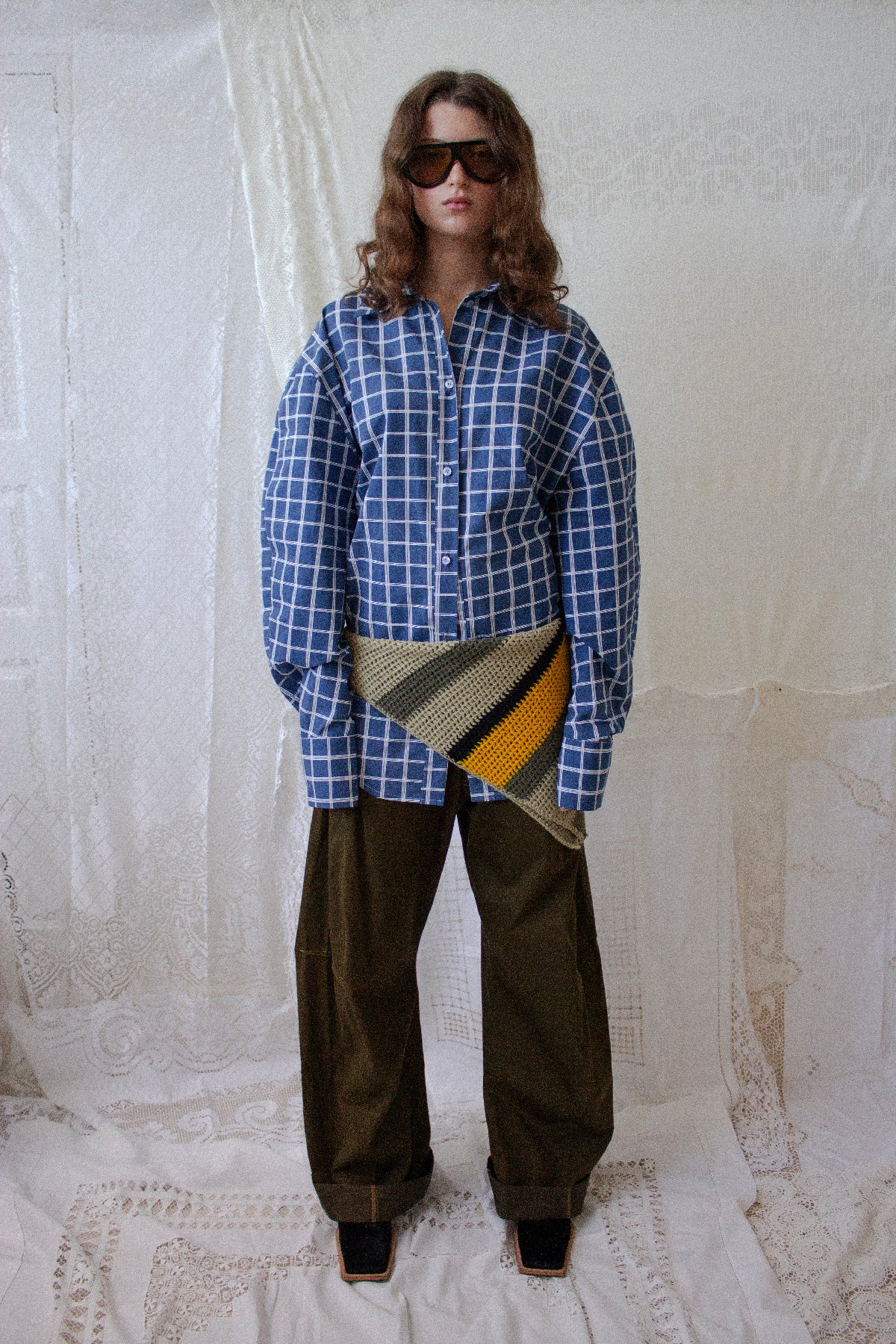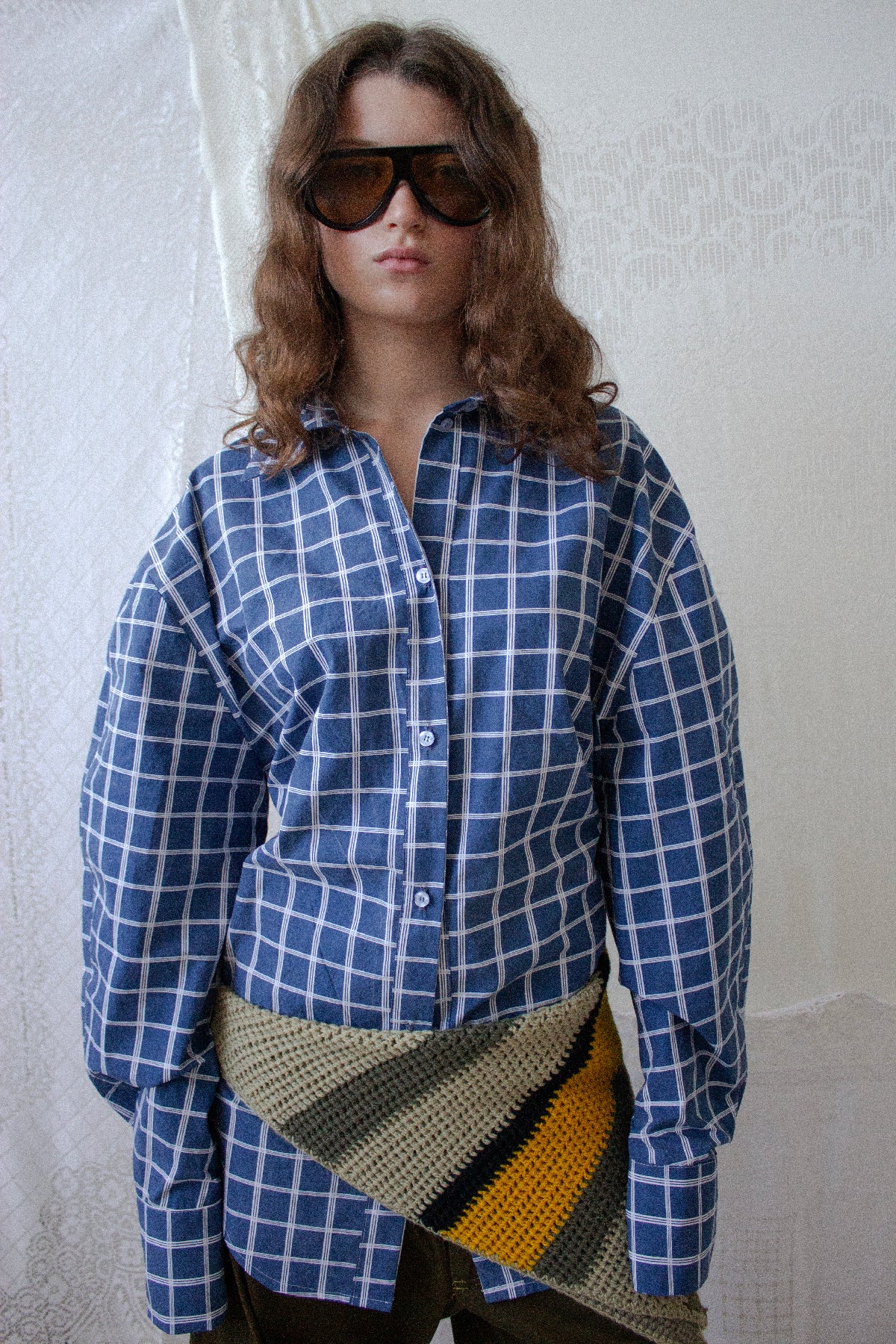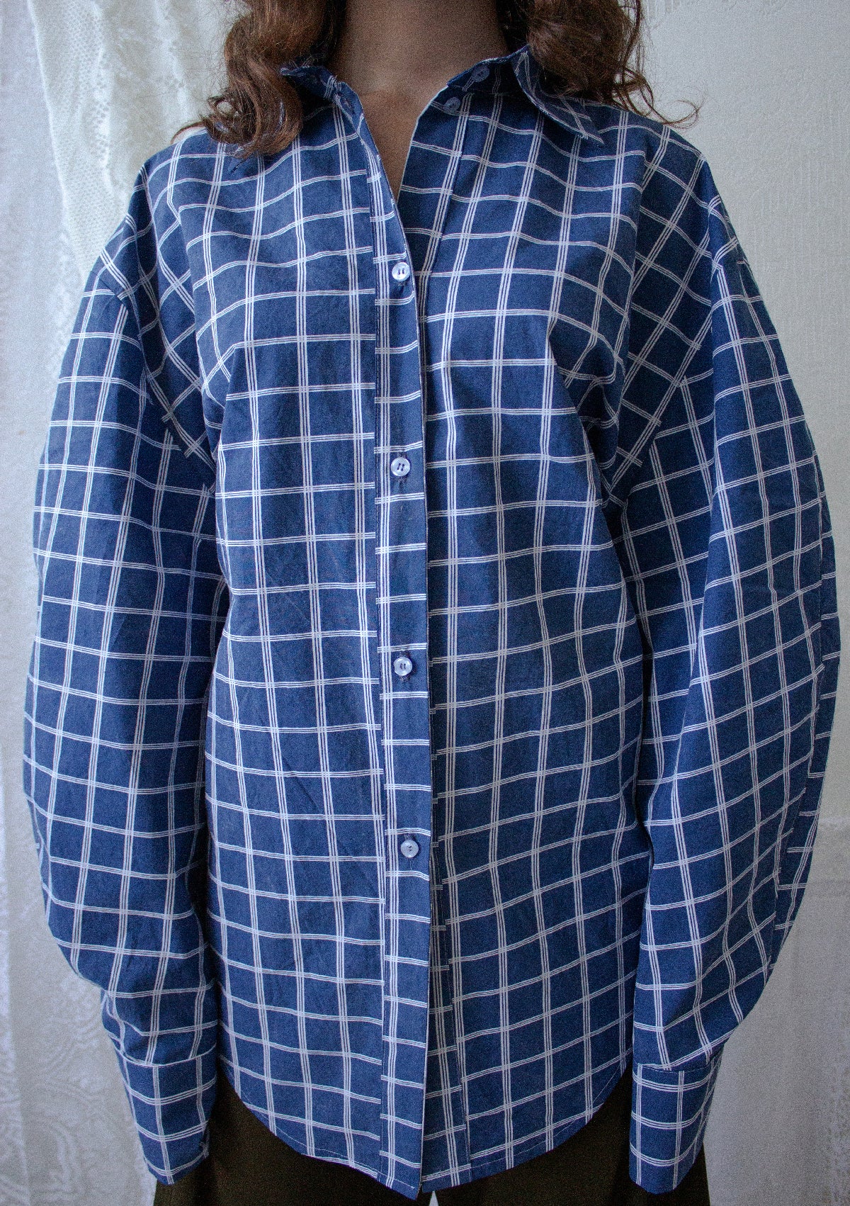 The Blue Check O Shirt is a loose fit elongated silhouette, with a curved hemline and rounded sleeves. It features 3 inverted box pleats at the low waist on the back, creating a flattering drape, but also makes the shirt look more slime line from the front.