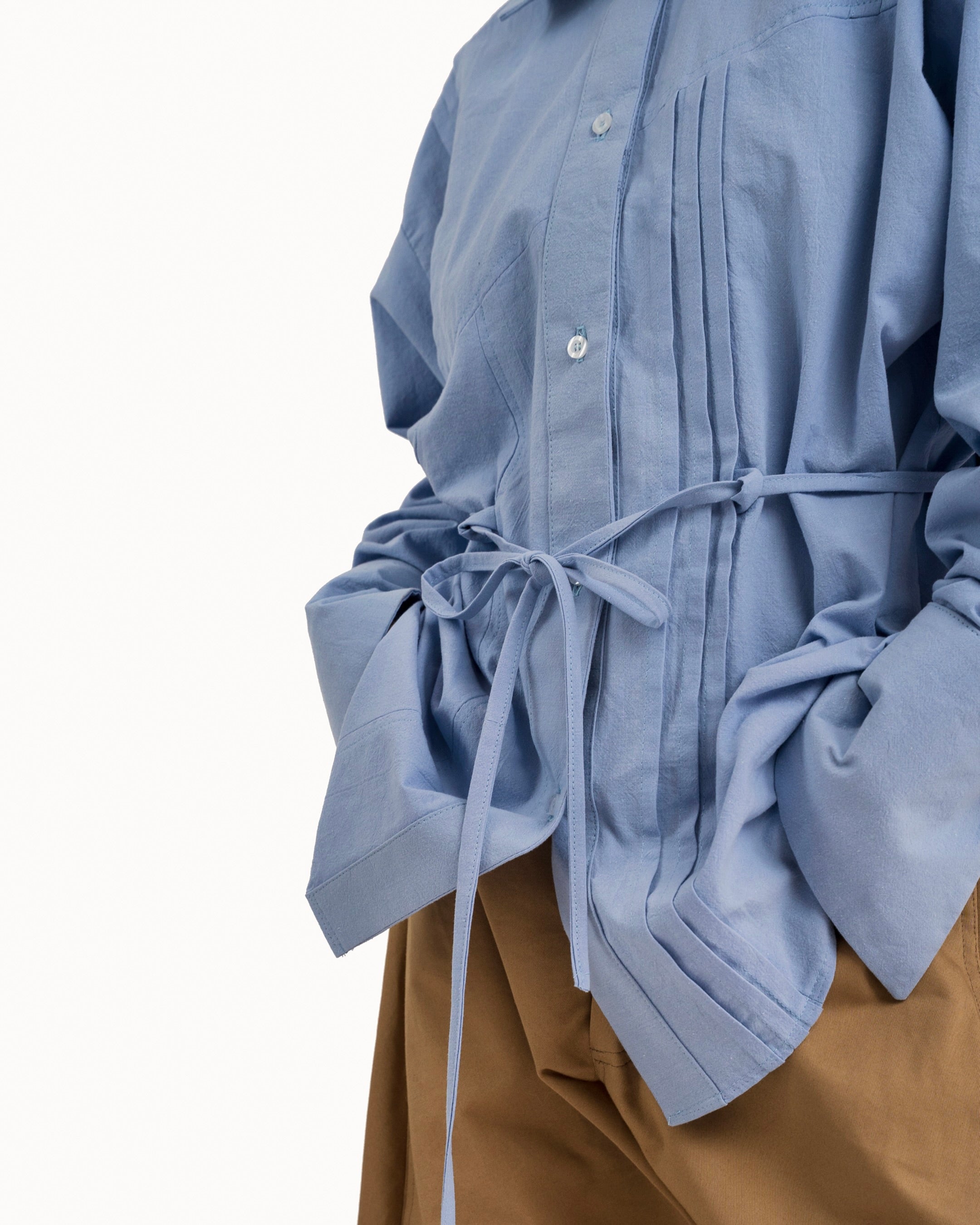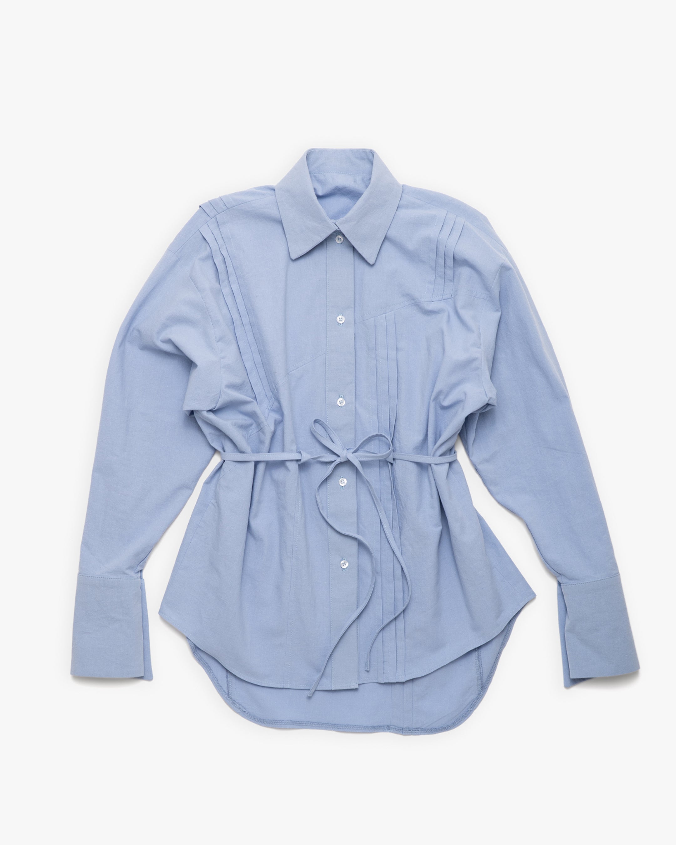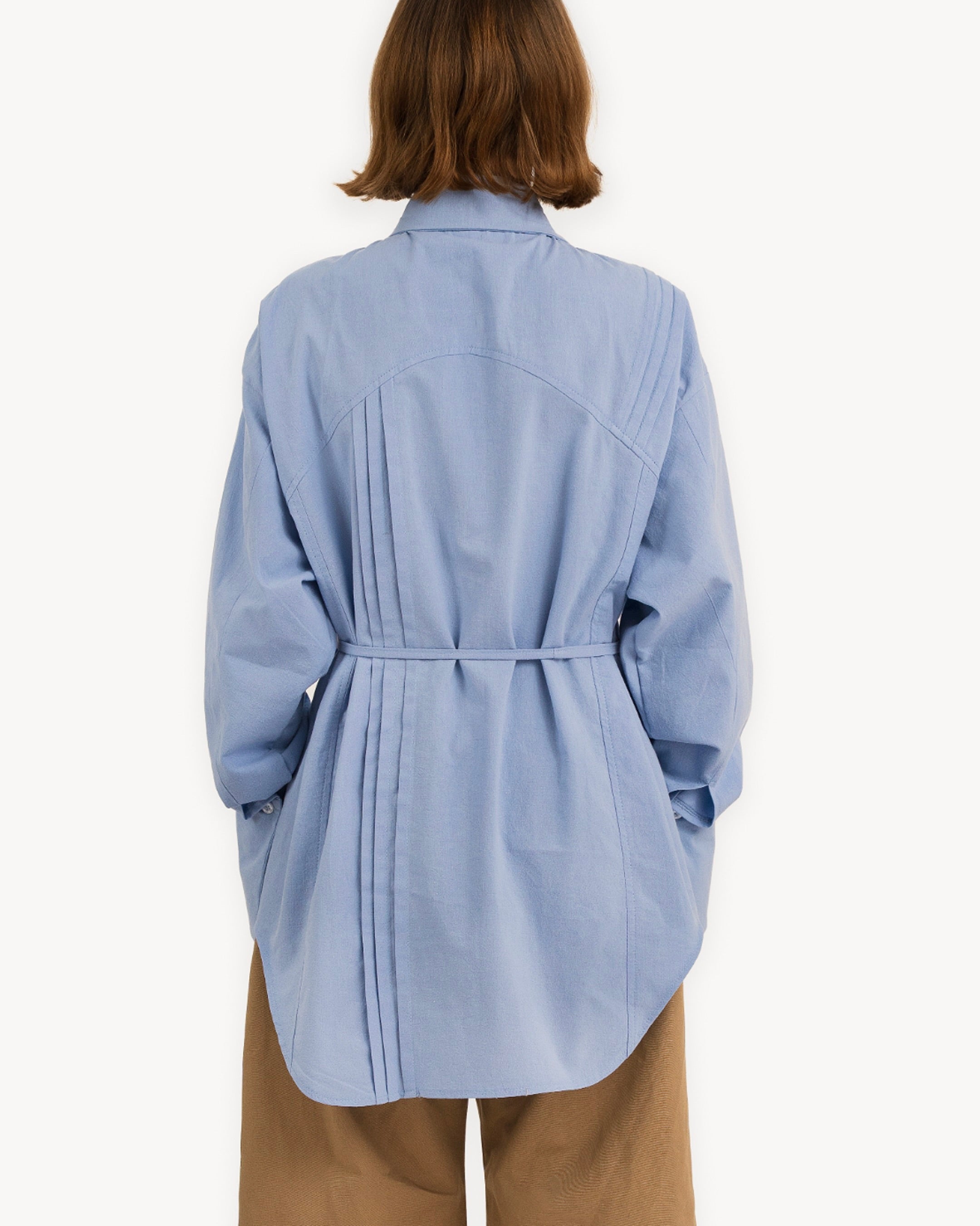The Blue Shirt is a loose fit elongated silhouette, with a curved hemline. It features pintuck details throughout the front and back, and a drawcord at the waist for a customizable sinched waist silhouette.