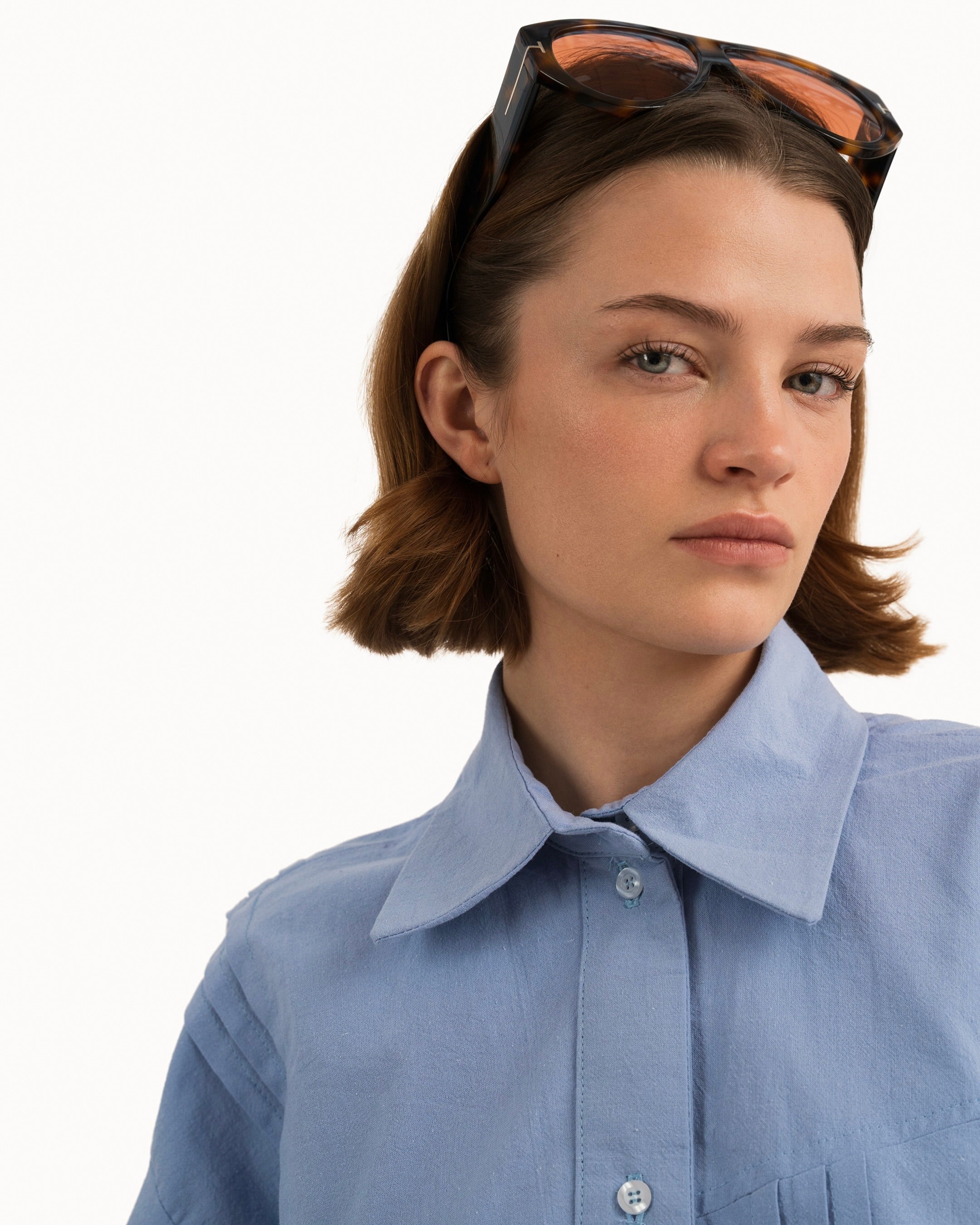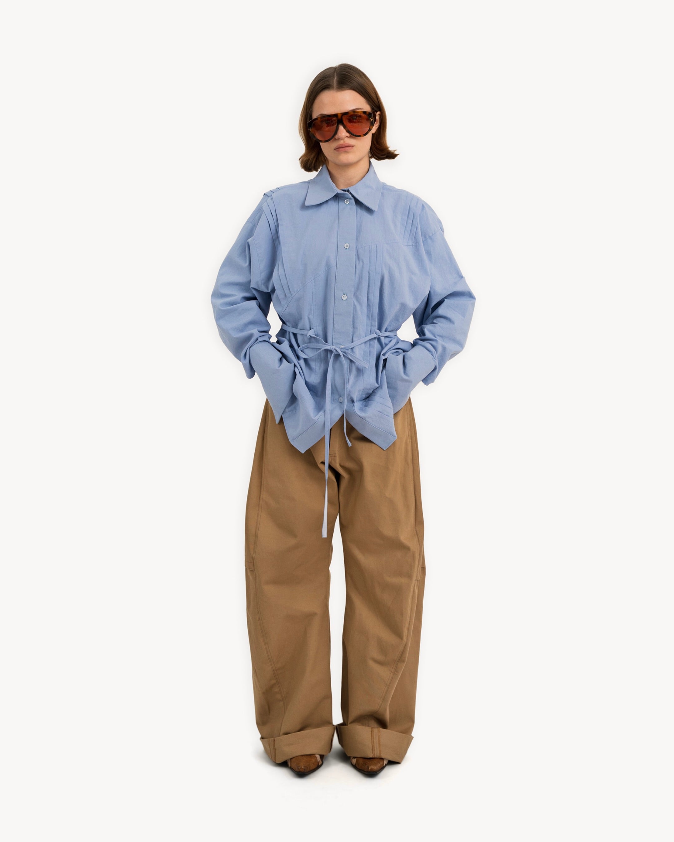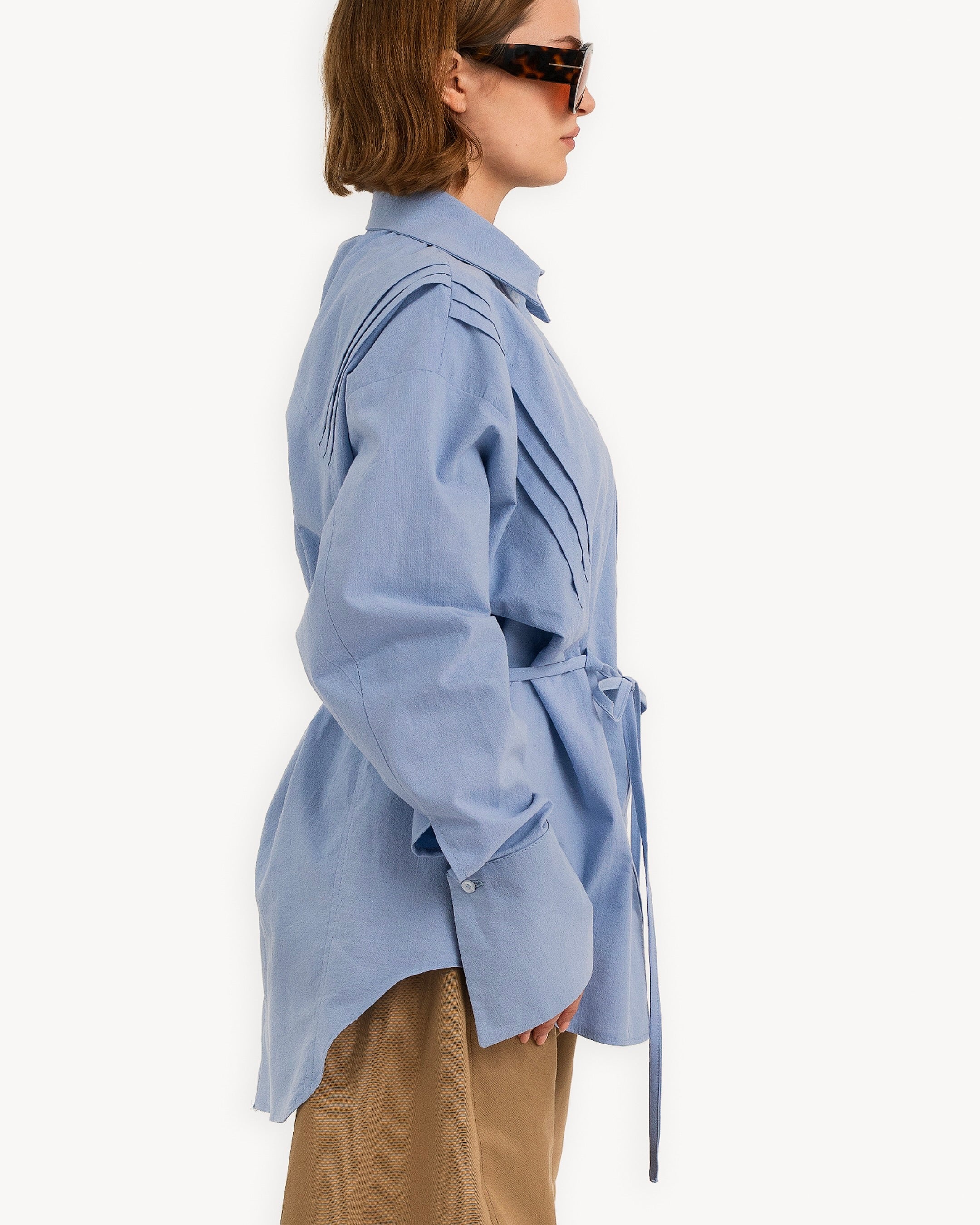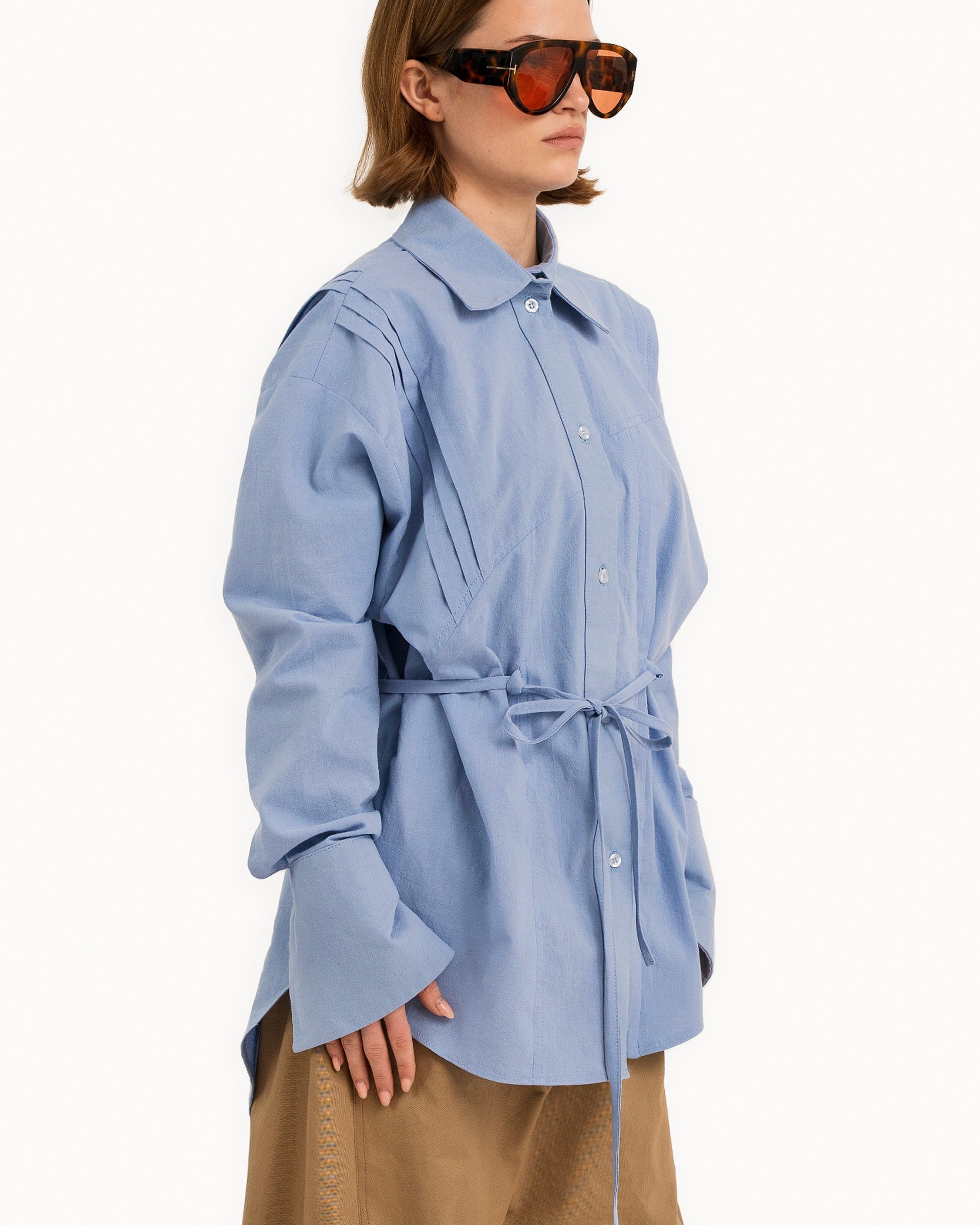 The Blue Shirt is a loose fit elongated silhouette, with a curved hemline. It features pintuck details throughout the front and back, and a drawcord at the waist for a customizable sinched waist silhouette.