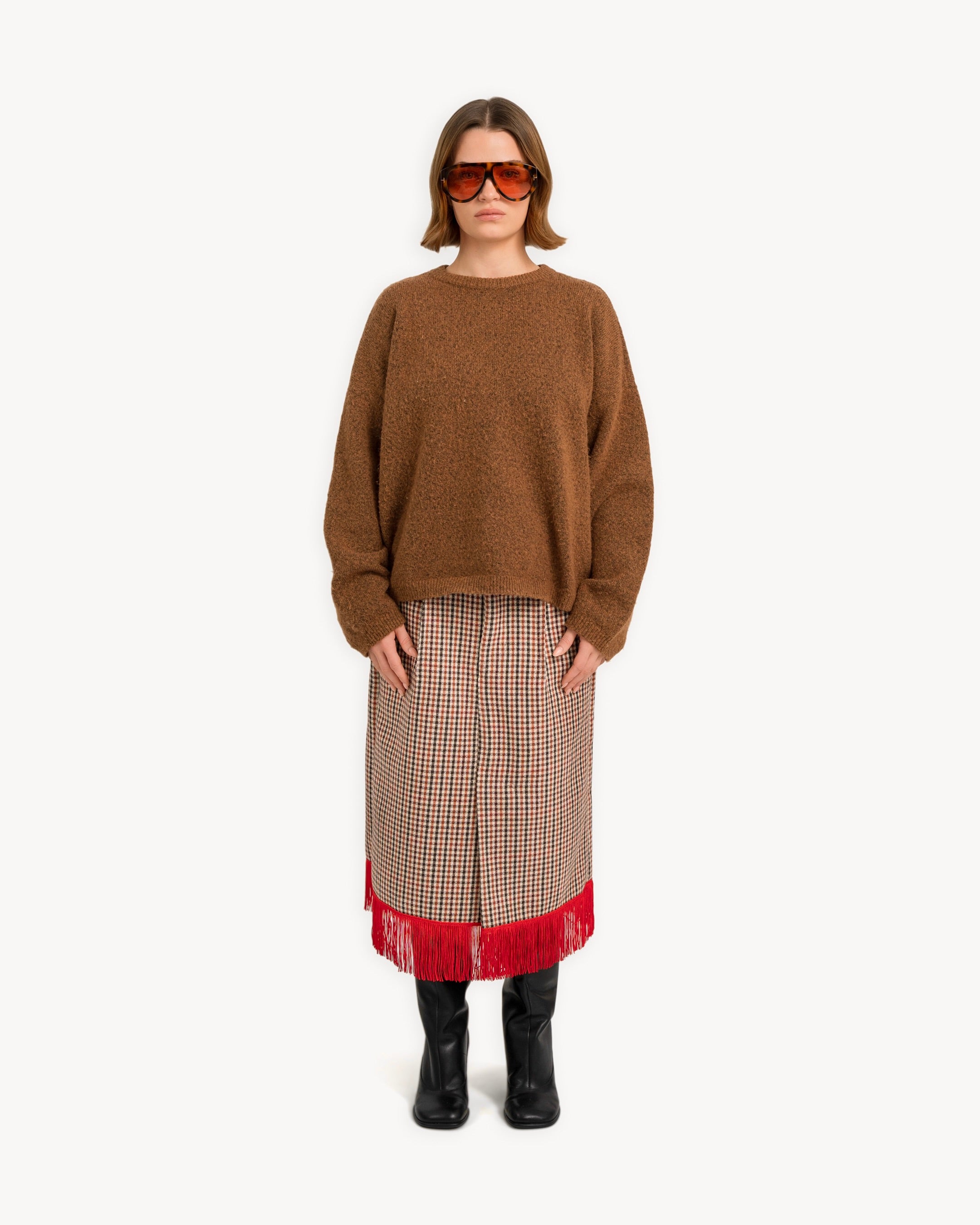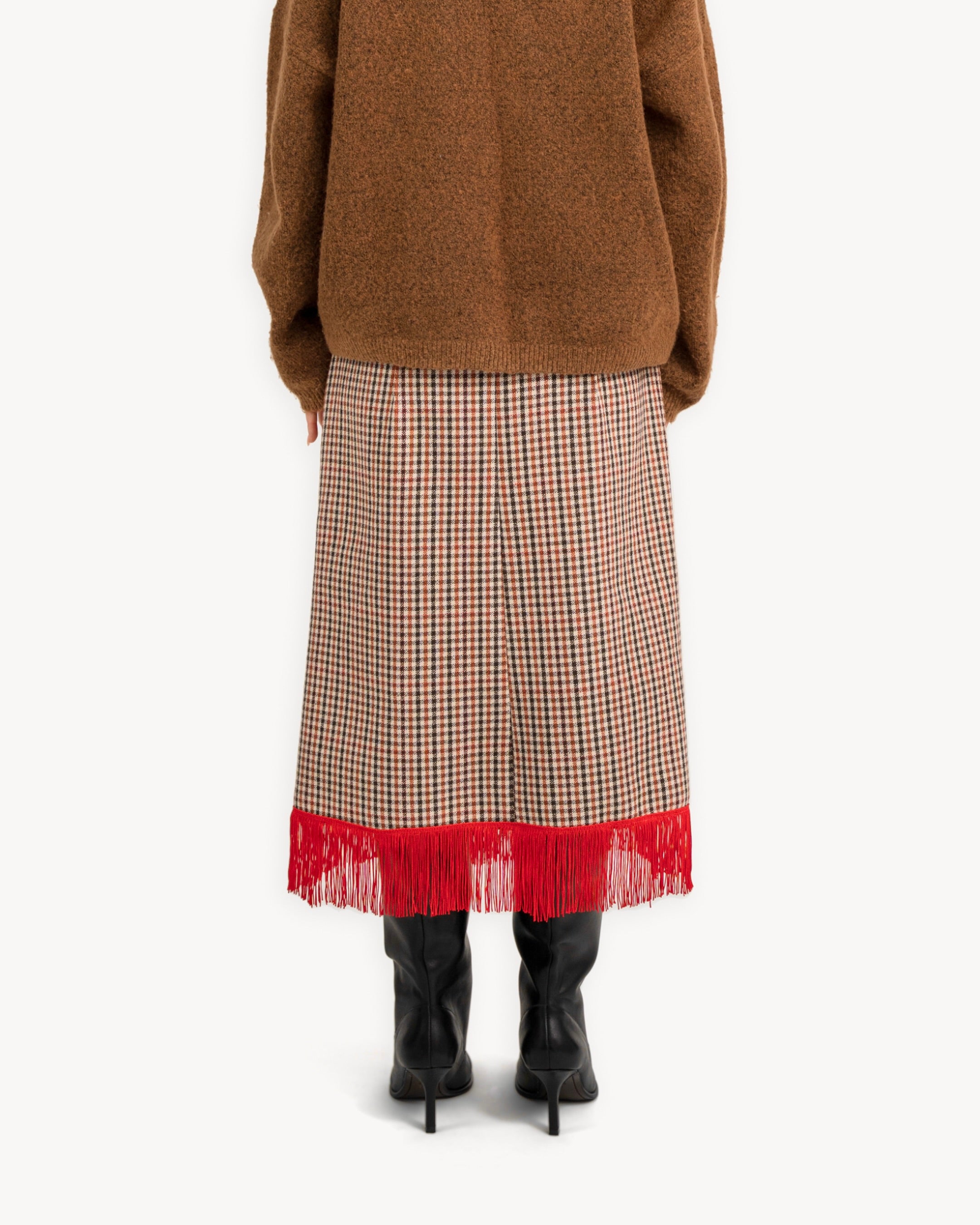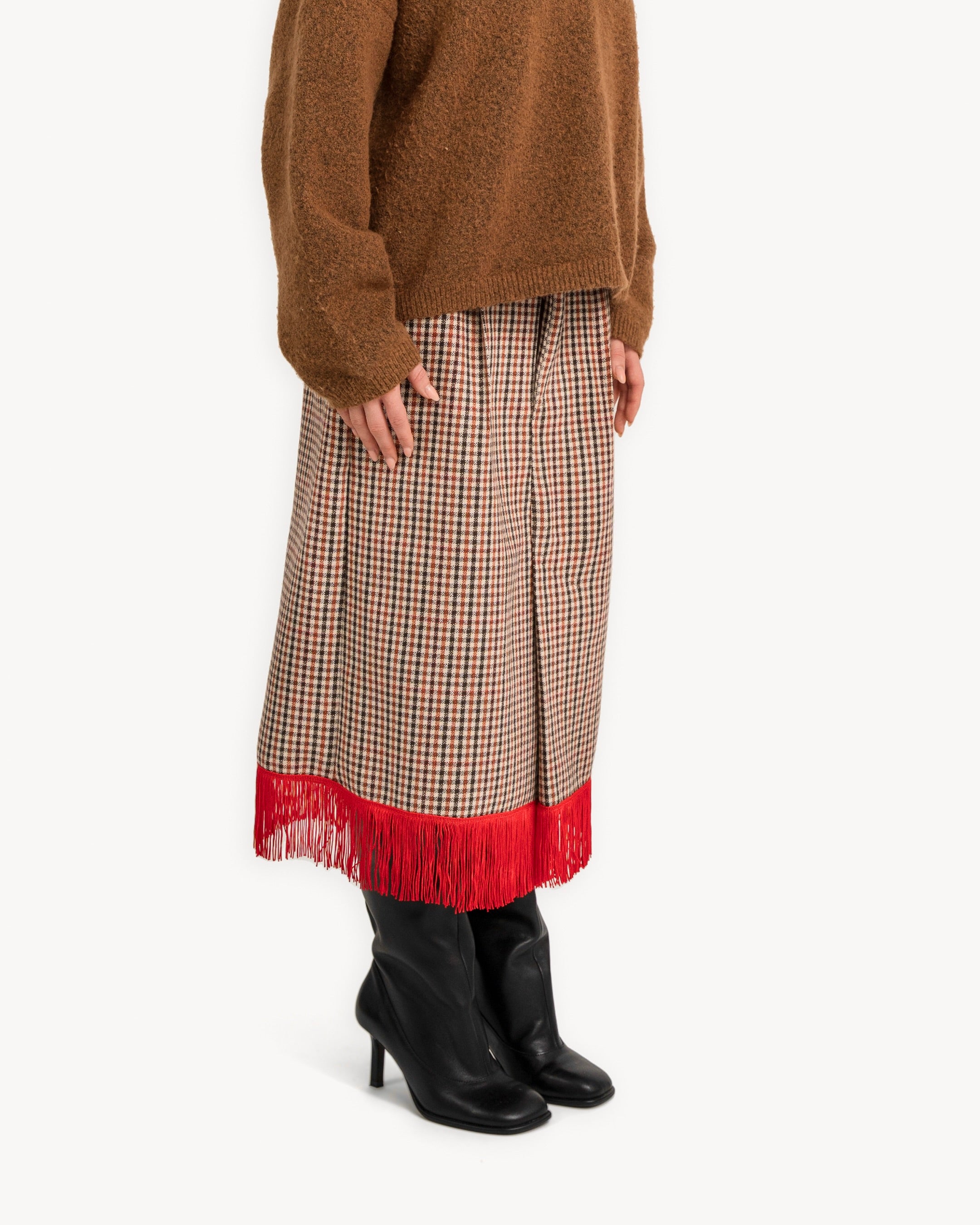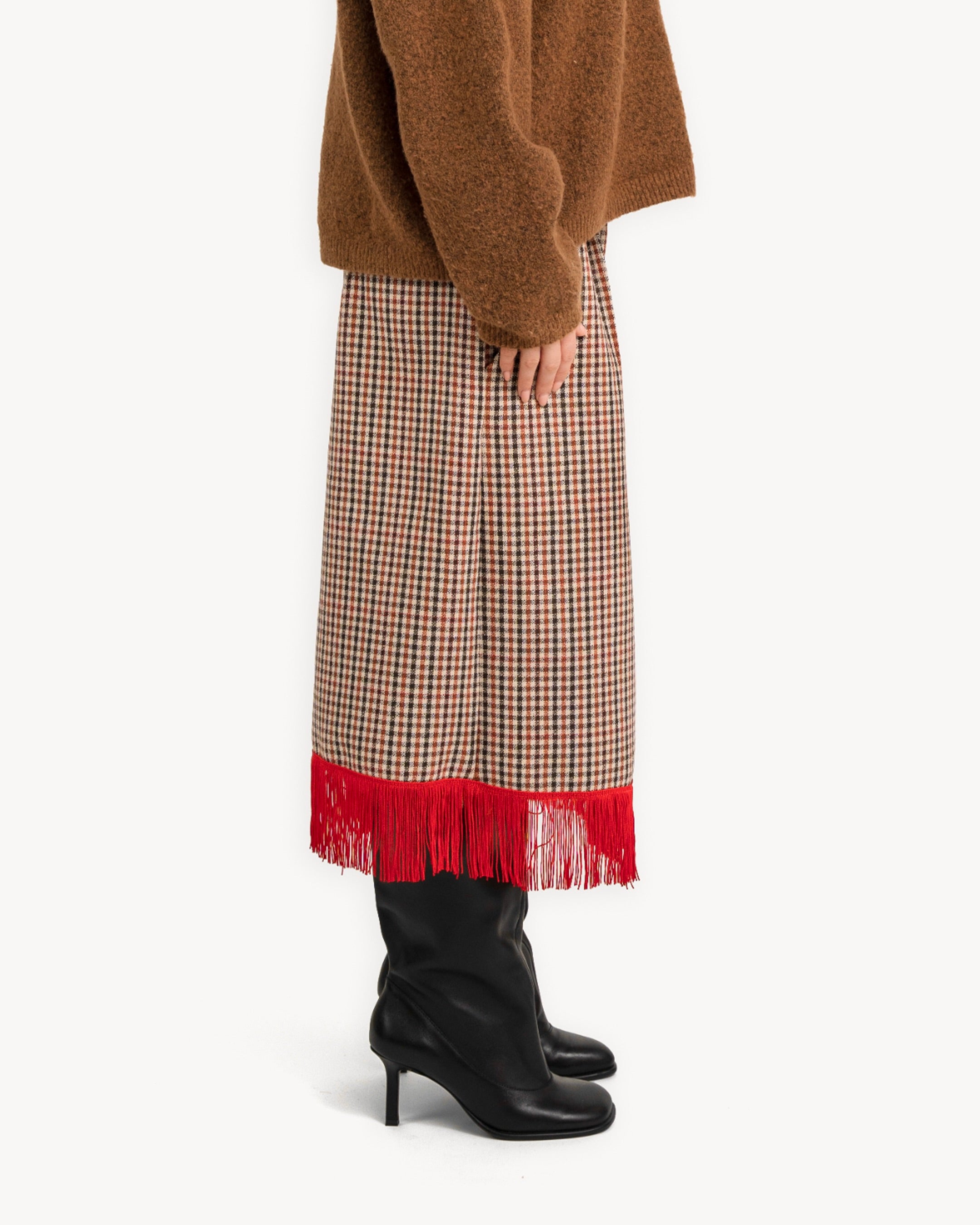 The Red Fringe Skirt is a pencil shape skirt made from deadstock wool with a red fringe hemline, and french pockets at front.